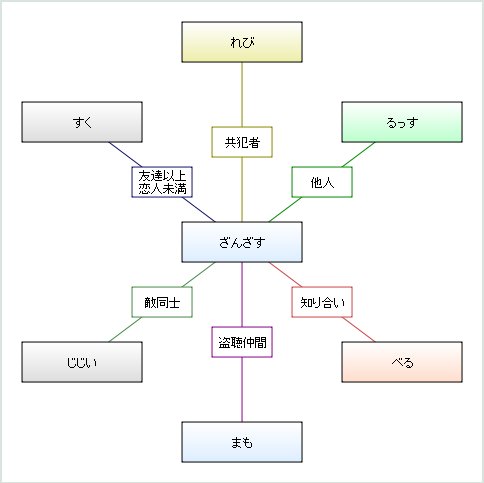 そうそう。相関図ジェネレータ(ttp://genzu.net/sokan/)をやってみたらなかなかの結果が出たので貼っておきますね。